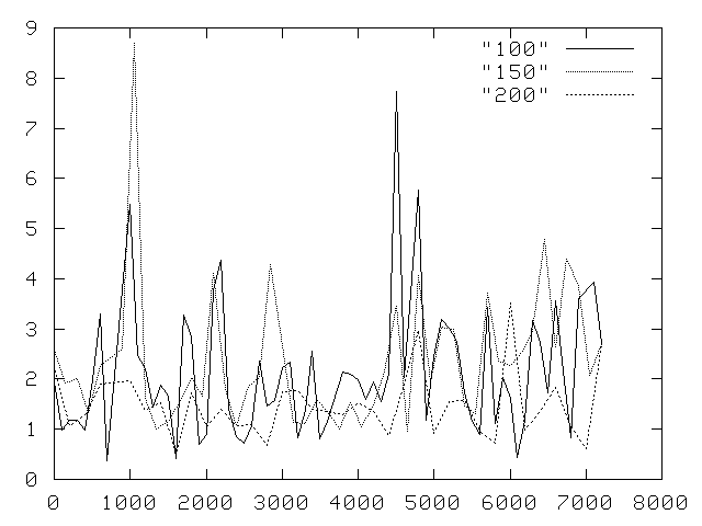 Fig. 2 ds/dn versus nucleotide position (bp) for ycf2 sequences. The "100", "150", and "200" lines represent ds/dn calculated over intervals of 100, 150, and 200 bp, respectively.